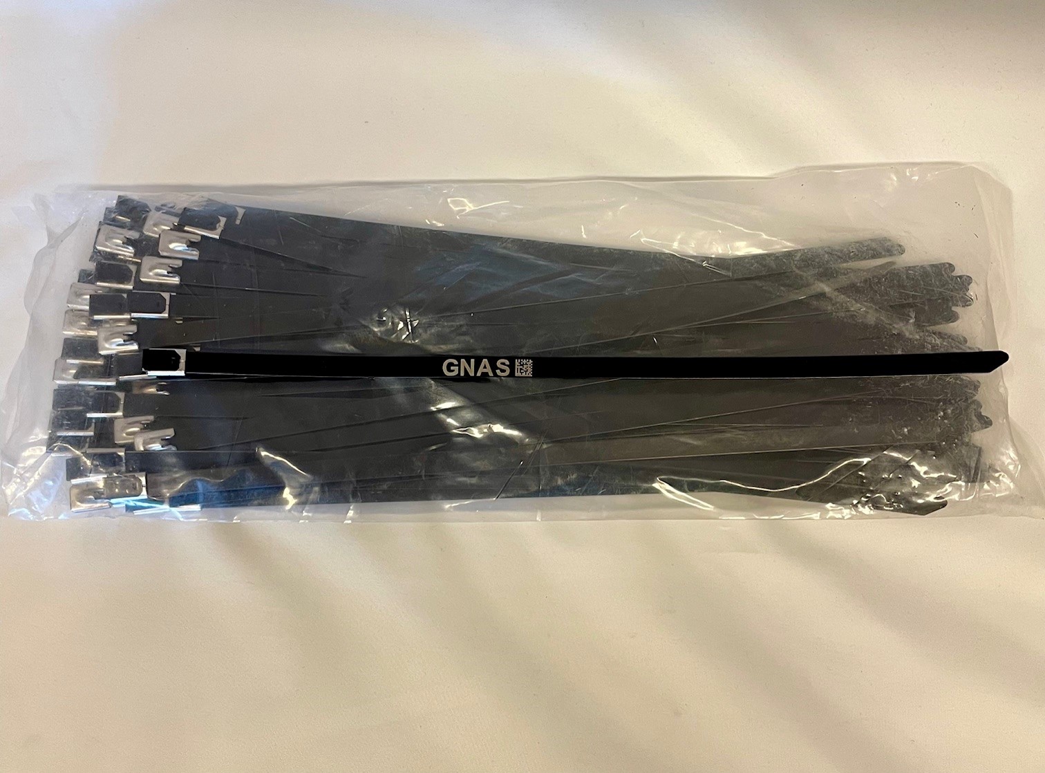 Solde strips i rusfritt stål (316) belagt med sort epoxylakk og med kulelås. Kan graveres med CO2-laser eller fiberlaser.